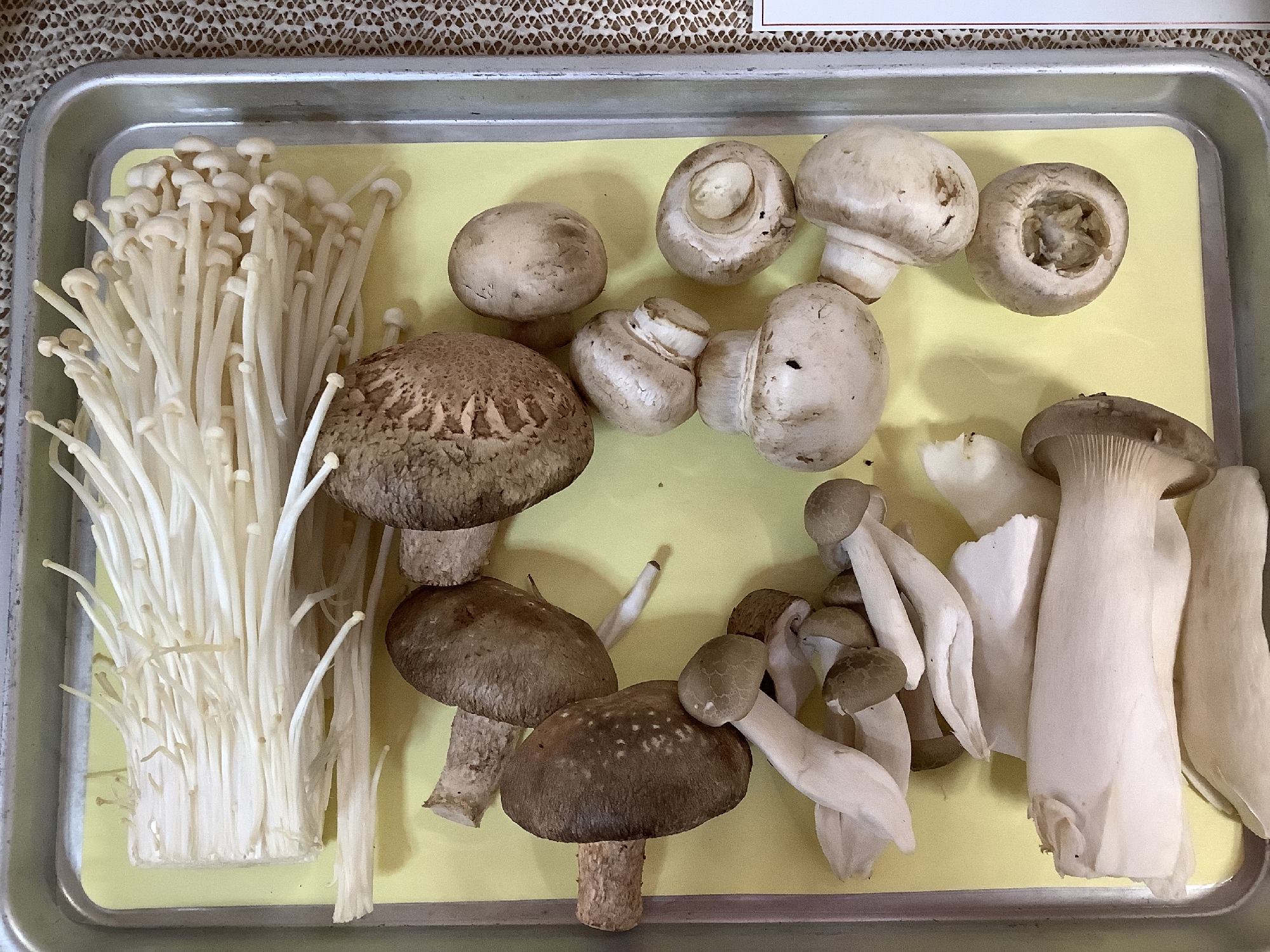しめじ、しいたけ、えのきたけ、エリンギ、マッシュルームの観察をし、