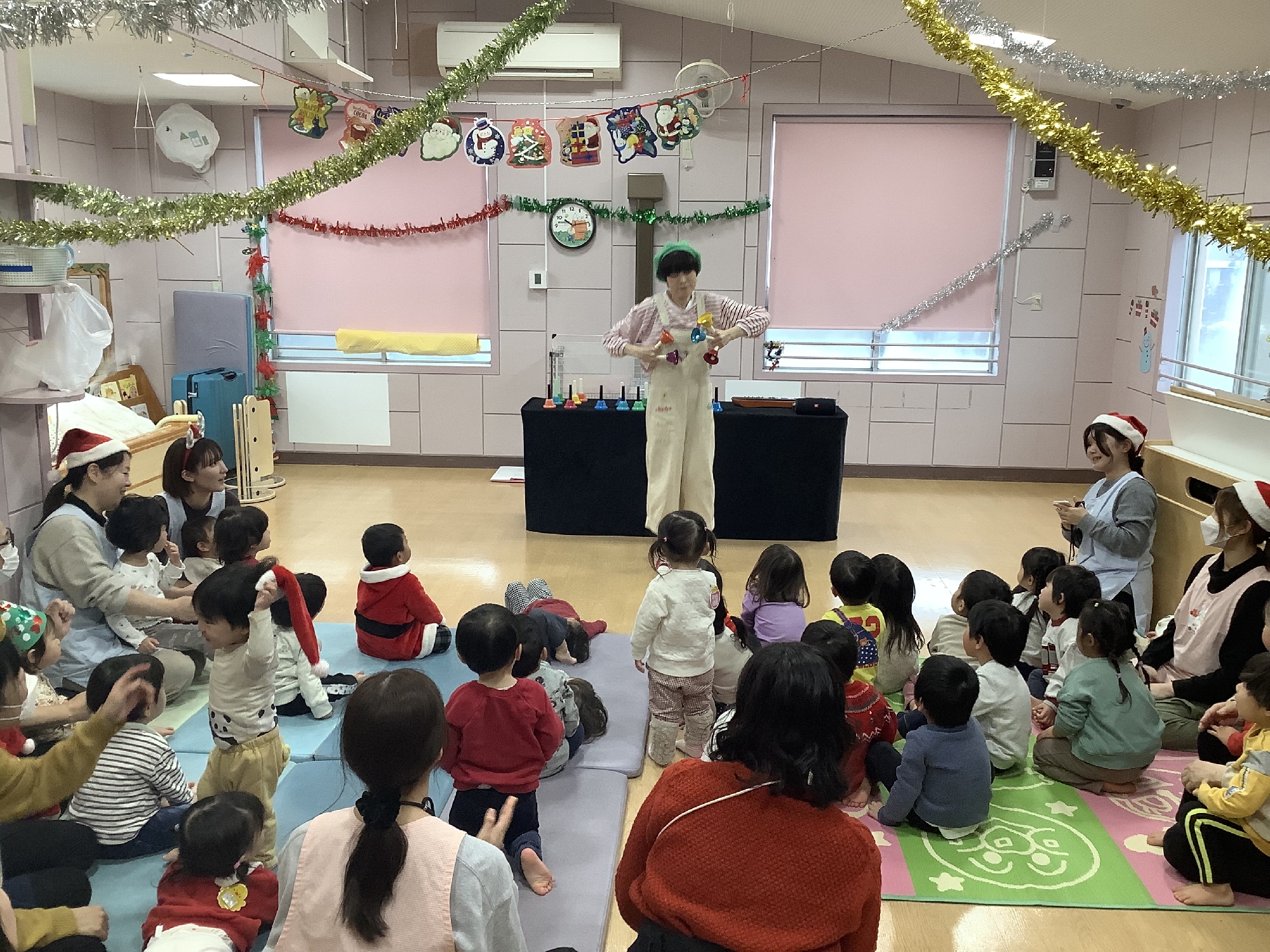 園児たちと一緒にハンドベルの演奏を聴き、その後はサンタクロースとご対面でした!